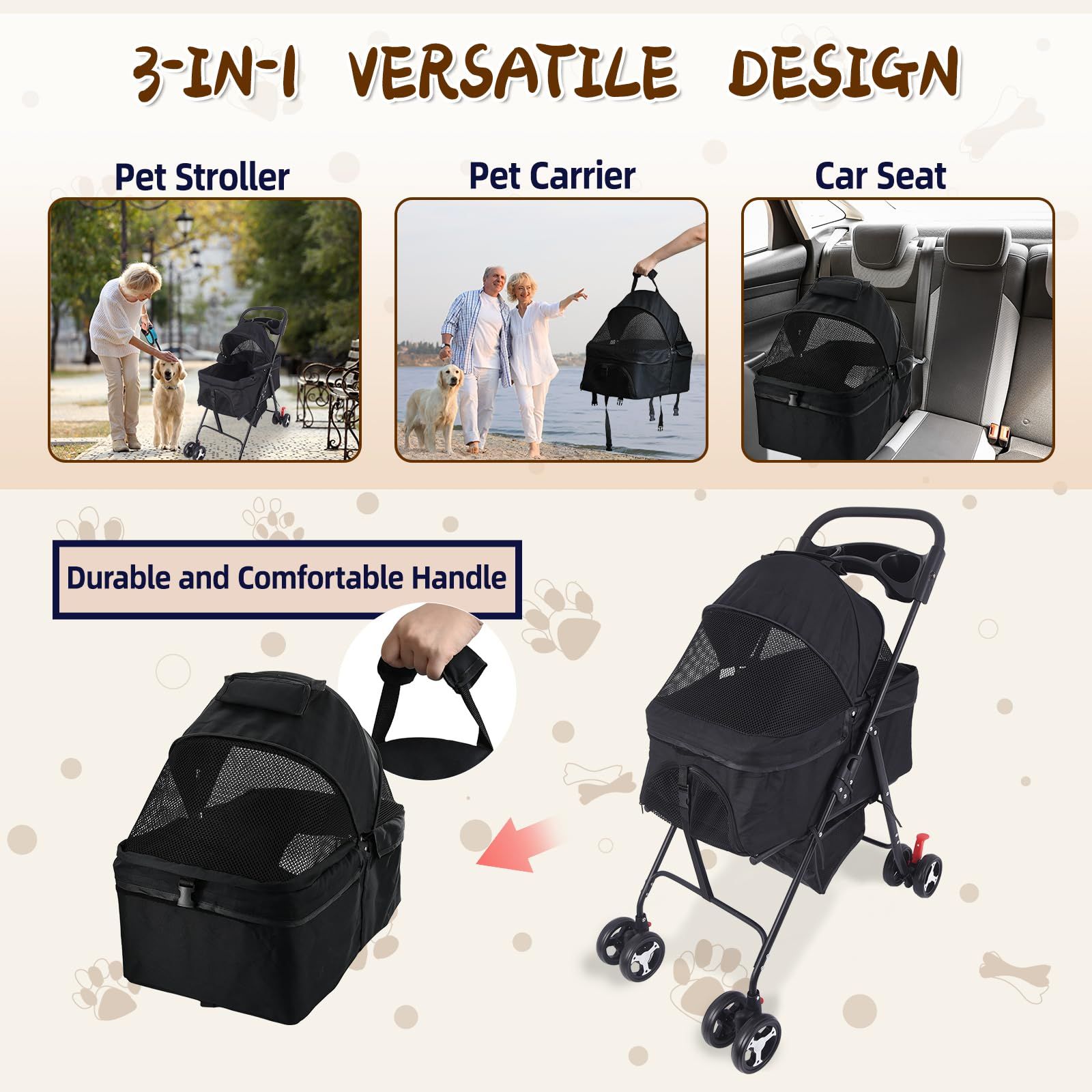 [3 In 1 Versatile Design]Pet Stroller - VAIDPRO folding pet stroller is reasonably designed to provide a comfortable riding space for pets. It has a stable structure and 2 safety belts, as well as 4 sturdy wheels to ensure the safety of pets during walking. Travel Carrier - carry cot of dog cat stroller is removable. Feel free to use it as a backup pet house. Car Seat - It can also be a car seat when sitting in a car. This dog stroller meets your needs for pet travel and provides a better living experience for pets and you.