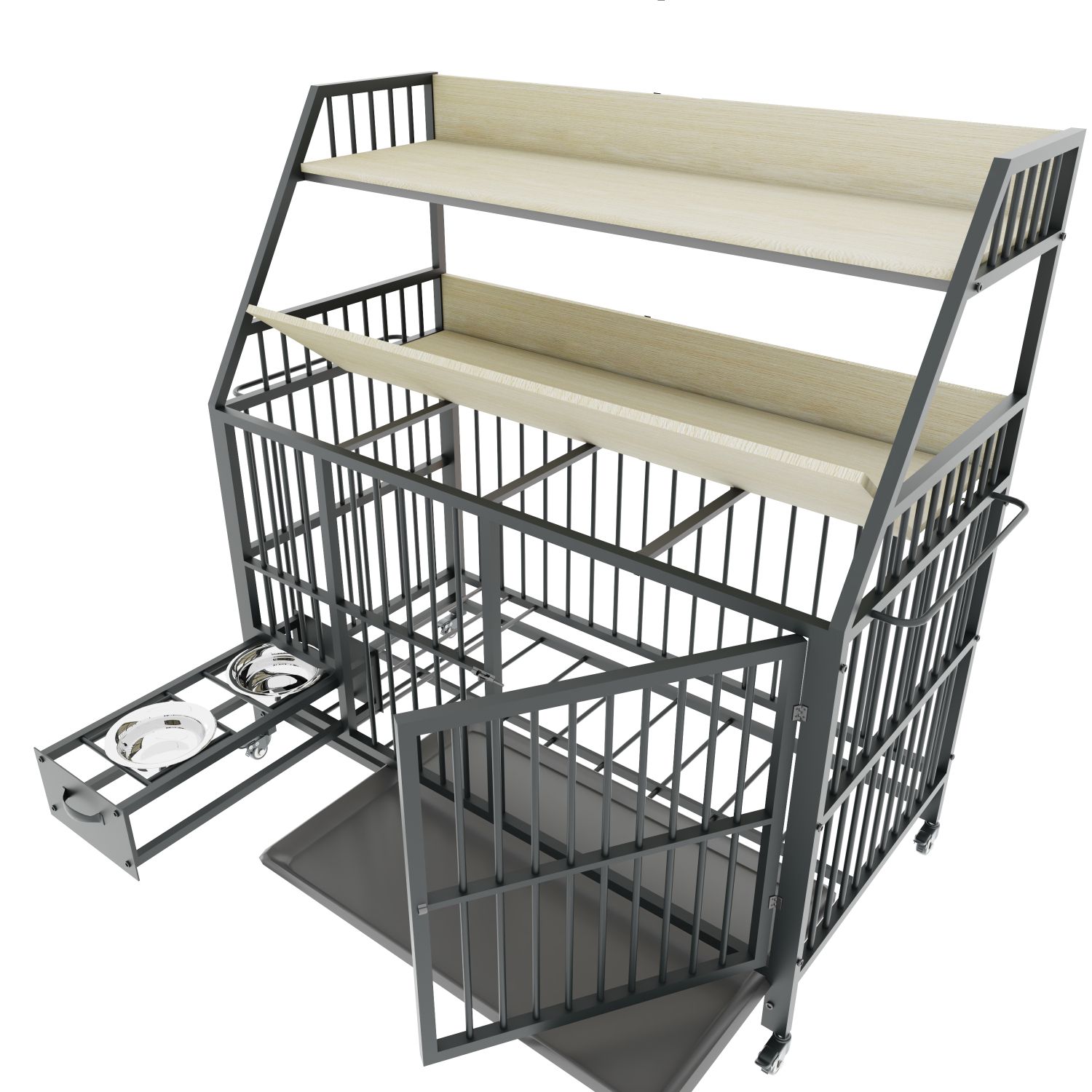The iron cage is exquisitely designed and creatively innovative. The storage rack can hold pet food and utensils, and the feeding drawer is equipped with stainless steel food and water basins, making it easy to feed pets