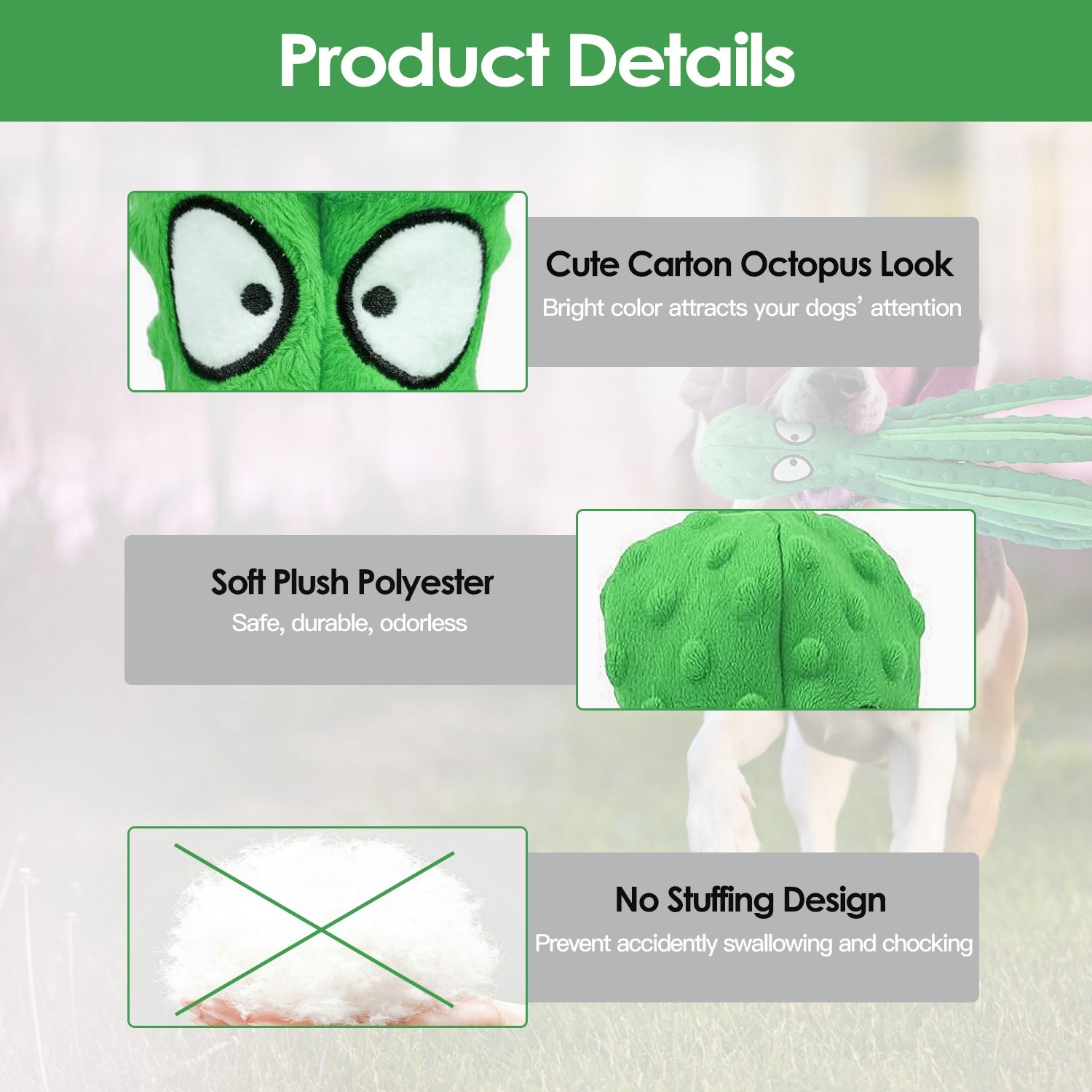 Material: Plush Polyester Surface, No Stuffing Crinkle Paper Fillings, Squeaky Ball