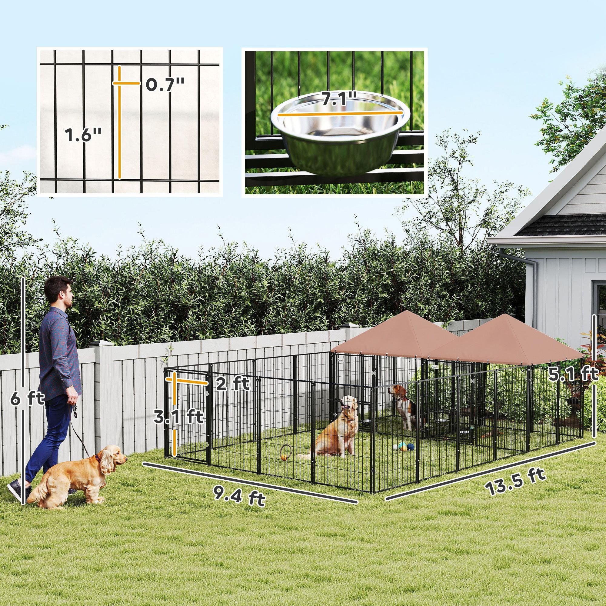 5.- Pet & Owner Friendly: Featuring a tall enclosure and wide-access door, this outdoor dog run prevents pets from jumping out, making entry and exit easy for owners. No more squeezing through tight spaces - just hassle-free access every time