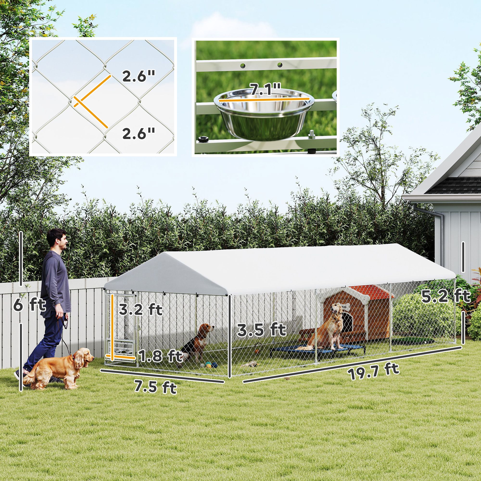 Outdoor Dog Kennel with Adjustable & Rotatable Bowl Rack, Waterproof Cover, Secure Lock, 19.7' x 7.5' x 5.2' Outdoor Dog Kennel with Adjustable & Rotatable Bowl Rack, Waterproof Cover, Secure Lock, 19.7' x 7.5' x 5.2' Outdoor Dog Kennel with Adjustable & Rotatable Bowl Rack, Waterproof Cover, Secure Lock, 19.7' x 7.5' x 5.2'