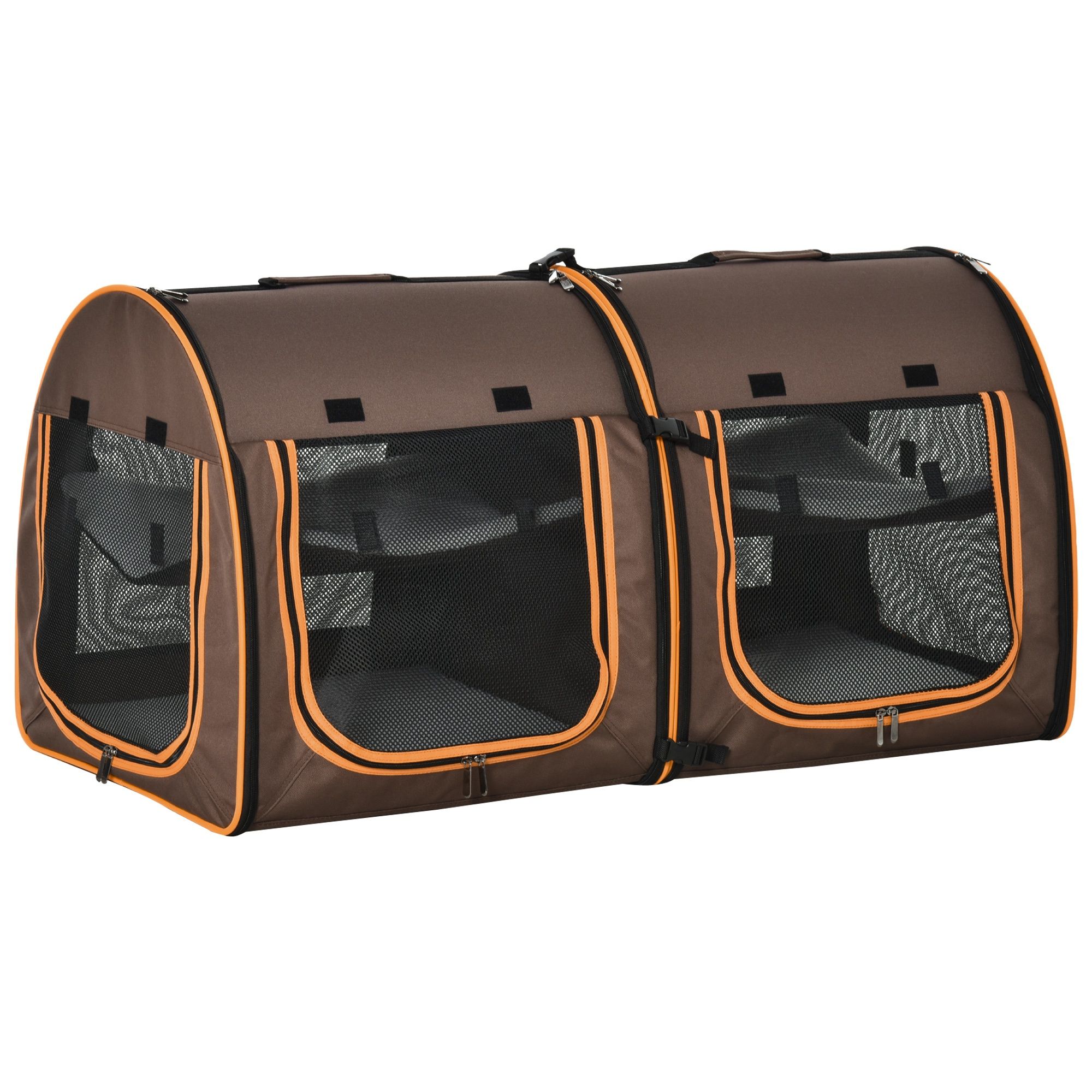 This soft-sided double enclosure vet pet carrier for small dogs or cats from PawHut can be used as 1 large enclosure or easily divided into 2 smaller areas with the center zippered flap. Each enclosure space features a large mesh screen for visibility and ventilation. Light portable and easy to carry this collapsible pet travel carrier is complete with carrying strap and handle for added safety for using as a pet booster seat. It includes a carrying strap for transport folds flat for storage and is made from durable water-resistant polyester fabric. Your pet will travel in comfort and style with this ultra-convenient and fashionable travel bag from PawHut!