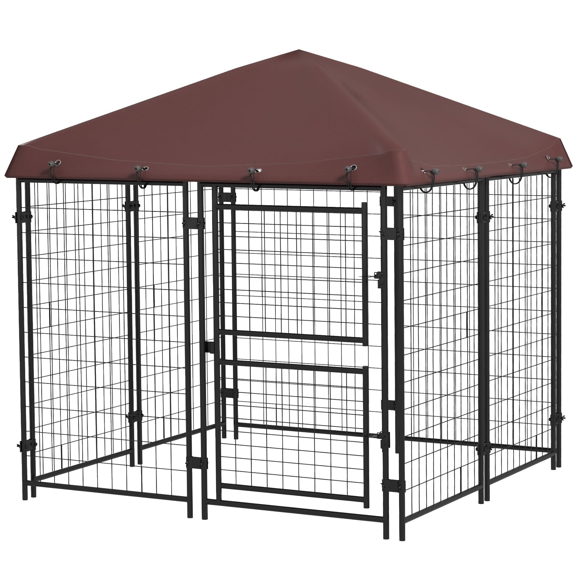 The PawHut outside dog kennel helps dogs burn energy, feel comfortable, and have plenty of space. Keep small and medium dogs cool, dry, and covered in a roofed space with shade and rainproof protection. Prevent excited pups from jumping over with a tall height. Our door is designed in two parts, so you can open the upper door to interact with your dog or the lower door to let them through. This heavy-duty dog kennel has strong steel railings, offering the outdoor readiness to endure harsh use.